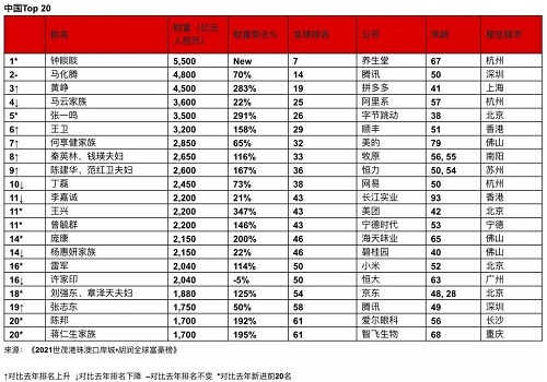 2020年新冠肺炎疫情對全球產生深遠的影響,財富榜單也經歷了大洗牌。進入前1000名的門檻比去年上升17%。前十名的門檻創歷史新高,達到800億美元。前十名企業家財富平均漲幅超過50%,總財富比去年增長9%,達到7.3萬億人民幣,占全榜單總財富的7.5%。
