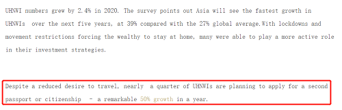 由于疫情導致的封鎖限制,導致富人們沒辦法進行全球范圍內的流動。所以調查顯示,有將近25%的超高凈值人士計劃申請第二身份以應對風險,這一數字在一年內增長了50%。