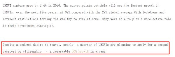 由于疫情導致的封鎖限制,富人們沒辦法進行全球范圍內的流動。所以調查顯示,24%的超高凈值人士計劃申請第二身份以應對風險,這一數字在一年內增長了50%。