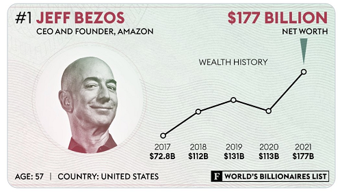 在最新排名中,亞馬遜創辦人貝佐斯(Jeff Bezos)連續第4年雄踞世界富豪榜首,身價高達1770億美元!比去年還多了640億美元……