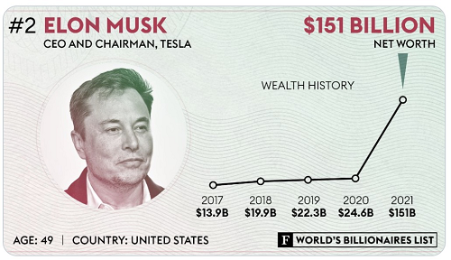 排名第二的是美國電動車大廠特斯拉首席執行員馬斯克(Elon Musk),他從去年的31名,一口氣飆升至第2名,資產1510億美元。這一年來增加了1264億美元,是財富增長最快的富豪。