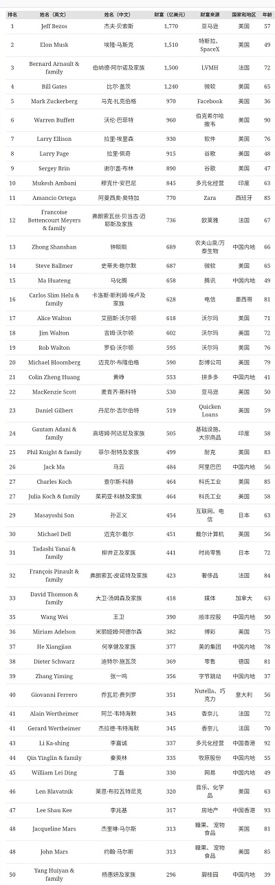 最后,為大家附上全球TOP50位頂級富豪名單: