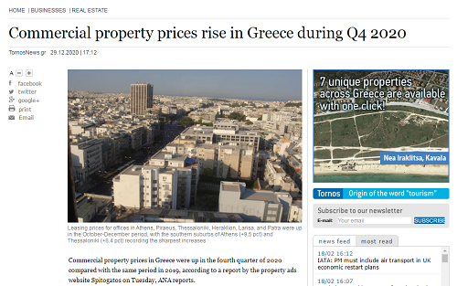 希臘房地產(chǎn)網(wǎng)站Spitogatos的統(tǒng)計數(shù)據(jù)顯示,希臘很多地方的房子繼第二季度和第三季度上漲后,第四季度和2019年同期相比,依然漲勢喜人,足以窺見希臘房產(chǎn)的抗跌能力。