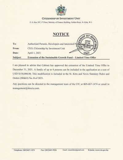 圣基茨移民局正式發(fā)布SGF捐贈(zèng)基金延期法案,規(guī)定在2021年12月31日前,一家四口及以內(nèi)申請(qǐng)身份降至15萬美金。