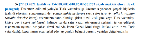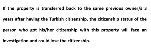 如果外國人從土耳其公民/公司購買房產并獲得了土耳其身份,三年房產持有期滿后,如果其將該房產賣回給同一賣家,則其公民身份將會被重新評估,且面臨被取消身份的風險。