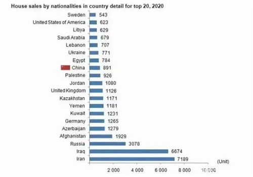另外還有投資人擔心是不是外國買家中主要是中國人,這里要告訴你,您想多了~數據顯示,中國買家2020年購買量為891套房產,前十都進不去,距離德國、英國等國的買家差距還是非常大的。