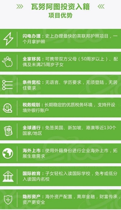 瓦努阿圖共和國于2016年起根據《國籍法》第112章第215條正式立法通過了《2016年國籍條例(經濟發展支持計劃)法令》,法令旨在通過瓦努阿圖護照項目籌集資金并吸納高素質的新移民,推動瓦努阿圖經濟發展。