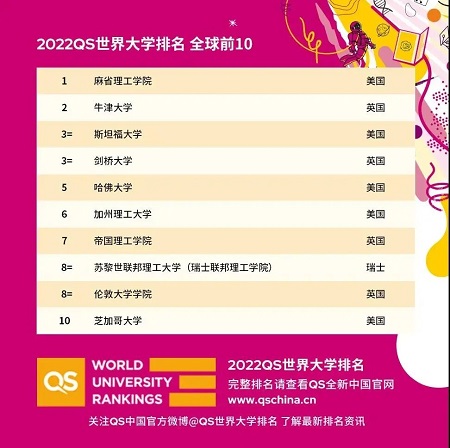 本次公布的QS2022年世界大學排名中,麻省理工學院創造了歷史,再次位居QS綜合排名榜首,拿下“十連冠”成就。而牛津大學、斯坦福大學、劍橋大學和哈佛大學分列二到五名。此外,位居前十位的高校包括加州理工學院、帝國理工學院、蘇黎世聯邦理工學院、倫敦大學學院、芝加哥大學。