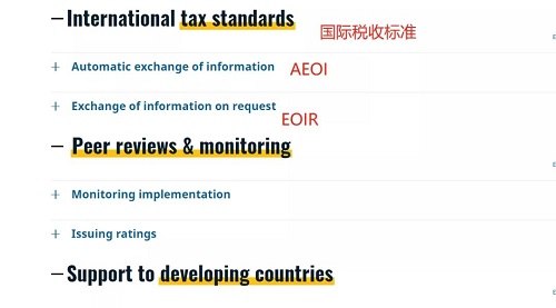 全球論壇主要做三件事:國際稅收的標準、同行評選與監督、支持發展中國家。在國際稅收標準中,主要有兩個層面。一方面是,自動交換信息(AEOI);另一方面是,根據要求交換信息(EOIR)。
