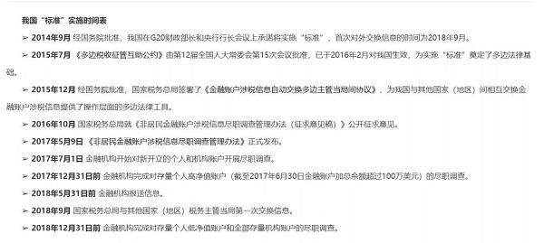 為了使金融機構可以收集需要收集的信息以報告給國家稅務總局,2016年中國國家稅總局發布了《非居民金融賬戶涉稅信息盡職調查管理辦法(征求意見稿)》隨后2017年正式發布。