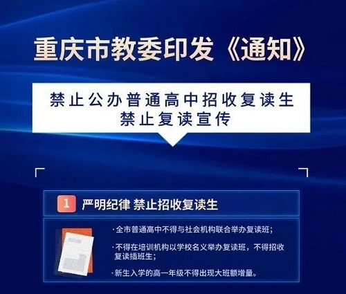 最近,重慶市教委發(fā)出《通知》,禁止公辦高中招收復讀生。