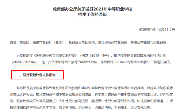 近年來國家嚴控普職比,希望可以達到1:1的良好發(fā)展。也就是說,一半中考生上普通高中,一半中考生被強制分流去職校,這是國家制定的政策。