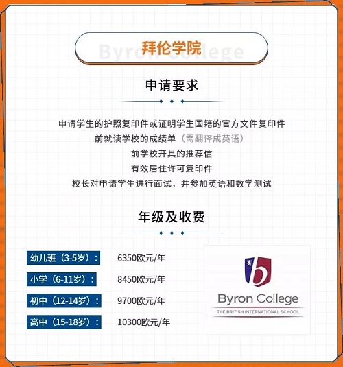 拜倫學院位于雅典北郊的純英式國際學校,成立于1986年。該校提供純英國式教育。該校設幼兒園、小學、中高中和大學預科班,年齡從3歲到18歲。現有學生300人,來自近50個國家。