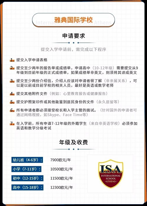 希臘僅ISA可以提供IBO三項課程的國際英語學校,ISA已獲得了美國中部地區學校及大學聯盟(MSA)的認可和日內瓦IB國際文憑認可(International Baccalaureate),可向高中二、三年級的學生提供國際文憑大學預科課程(IB Diploma)。ISA具有高水平的教學系統,優質的教育資源,還為在校學生提供心理咨詢和顧問支持,就業方向指導以及為進入希臘、歐盟、美國優質教育機構提供咨詢。