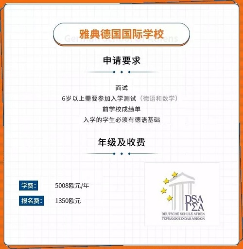 雅典德國國際學校位于希臘雅典,是一所獨立的男女混合中學。學校成立于1896年,由建筑師和考古學家Wilhelm Dorpfeld建成。因為孩子同時享受德語和希臘語授教,而且必須年終通過德語和希臘語期末考試,所以雅典德國學校一直被認為是一所選擇性很高的學校。此外,學生畢業后同時擁有希臘和德國的高中畢業文憑。學生必須通過入學考試才能成功入學。