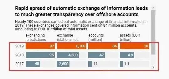 · 2019年交換了8400萬個金融賬戶的信息,資產折合10萬億歐元。