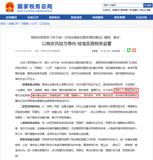 2021年4月29日,國(guó)家稅務(wù)總局稽查局在總局官方網(wǎng)站發(fā)布“稅務(wù)總局貫徹《關(guān)于進(jìn)一步深化稅收征管改革的意見(jiàn)》精神,要求:以稅收風(fēng)險(xiǎn)為導(dǎo)向 精準(zhǔn)實(shí)施稅務(wù)監(jiān)管”一文,公布了2021年全國(guó)稅務(wù)系統(tǒng)稽查工作的八個(gè)重點(diǎn)領(lǐng)域和行業(yè)以及五類涉稅違法行為。