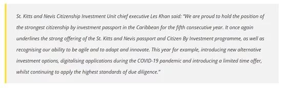 對此,圣基茨和尼維斯公民投資部首席執行官Les Khan說:我們很自豪能夠連續第五年在加勒比地區持有投資護照最強大的公民地位。它再次強調了圣基茨和尼維斯護照和投資公民計劃的強大屬性,并認可我們的快捷性、適應和創新能力。