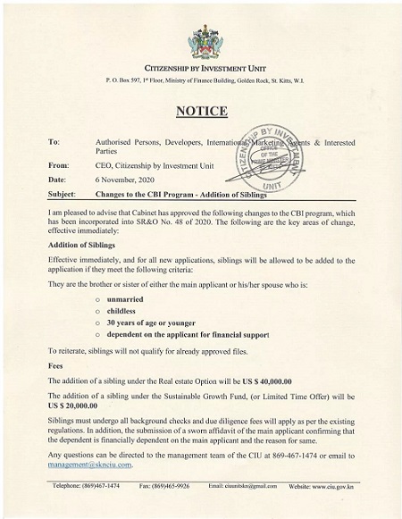 報告指出,投資者越來越重視那些能跟家人一同申請身份的CBI計劃,而2020年11月6日,圣基茨和尼維斯移民局發布通知,圣基茨投資入籍計劃正式將主申請人的兄弟姐妹納入法案中。這意味著,兄弟姐妹可隨主申請人一道申請圣基茨和尼維斯身份。