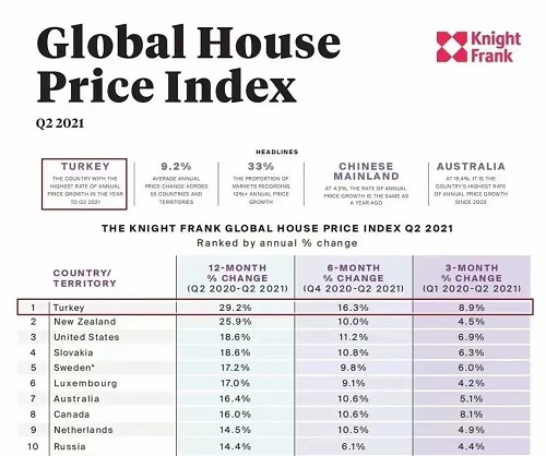 截至2021年第二季度,土耳其房價漲幅依然位居全球首位,漲幅達到了29.2%,其次是新西蘭25.9%,美國和斯洛伐克漲幅并列第3位,漲幅達到了18.6%,中國大陸位于第40位,漲幅達4.3%。