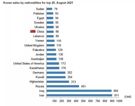 從國家來看:除了中東的投資客外,還有來自俄羅斯、德國、美國、英國、英國、瑞典的買家,中國投資者共購買了98套房產,位第十五位。