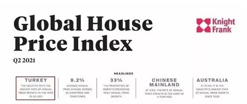 而且土耳其房價也同步飆升。根據萊坊發布的全球房價報告顯示,截至2021年第二季度,土耳其房價漲幅更是位居全球N0.1(第二季度),漲幅達到了29.2%。其次是新西蘭25.9%,美國和斯洛伐克漲幅并列第3位,漲幅達到了18.6%。