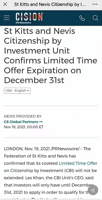 但就在“優惠期”接近尾聲之時,圣基茨與尼維斯移民局近日確認,不會再將該優惠延期,這讓見慣了限時優惠屢屢延期的申請者們猝不及防。
