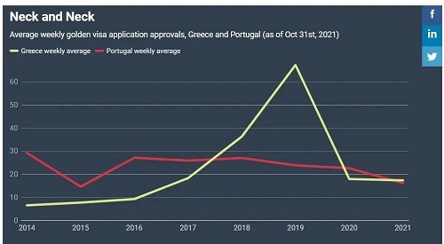 這也意味著希臘將于明年1季度的某個時候突破其黃金簽證批準量1萬個大關,而葡萄牙項目已于今年9月實現了這一里程碑。