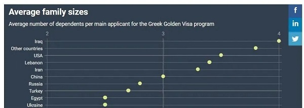 希臘黃金簽證申請人來源地分布 我們還看到各申請人團體平均家庭大小差異很大;平均來看,烏克蘭投資者的申請案中只有1.5名家屬,但是伊拉克投資者的家屬數量則是其兩倍。