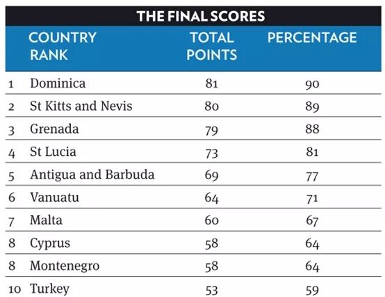 在綜合比較中,加勒比海國家繼續(xù)保持了歷年來的領(lǐng)先地位,多米尼克再次拔得頭籌。多米尼克成功在高效簡便的申請流程與擴大的附屬申請人資格中實現(xiàn)平衡,并以可靠的盡職調(diào)查和出色的整體聲譽見稱。