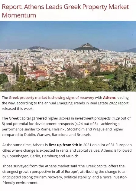 普華永道(PwC)和城市土地研究所(Urban Land Institute)對歐洲房地產市場的最新年度調查顯示,希臘首都雅典未來的資本收益和租金上漲態勢將在歐洲31個城市中處于領先地位。