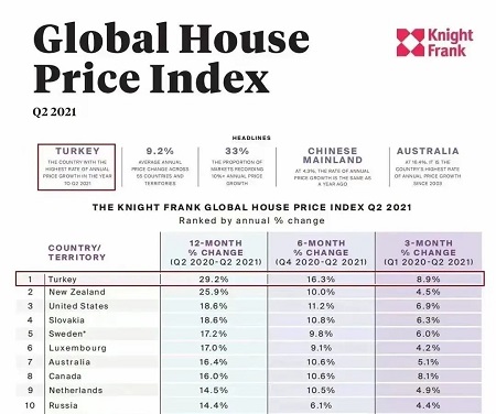 在2021年《全球房價指數》報告中,實際漲幅前十的國家,歐洲占了6個:瑞典、土耳其、荷蘭、澤西島、斯洛伐克以及丹麥,漲幅在11.1%-17.8%之間。