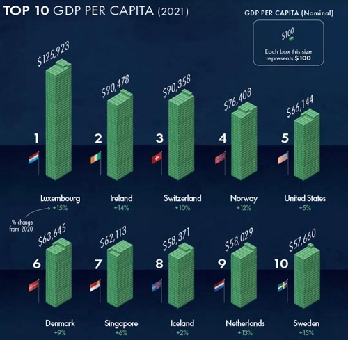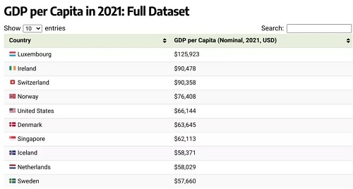 近年來,愛爾蘭人均GDP一直在歐盟乃至全球有著驕人的成績。它是2020年唯一增長的歐盟經濟體,在《2021經濟自由度指數》排名中高居歐洲第2、全球第5,根據國際貨幣基金組織的數據,愛爾蘭2021年人均GDP為90478美元,排名全球第二!僅次于盧森堡!