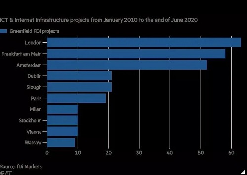 據行業協會Host in Ireland數據報告,愛爾蘭擁有60個數據中心,從2020年起,都柏林就成為了歐洲第四大ICT和互聯網基礎設施投資接受城市,擁有21個相關投資項目,其中大部分是數據中心項目。