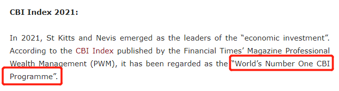 2021年,圣基茨和尼維斯成為“投資入籍界”的領頭羊。根據英國《金融時報》雜志專業財富管理(PWM)發布的CBI指數,它被評為“世界排名第一的CBI項目”。