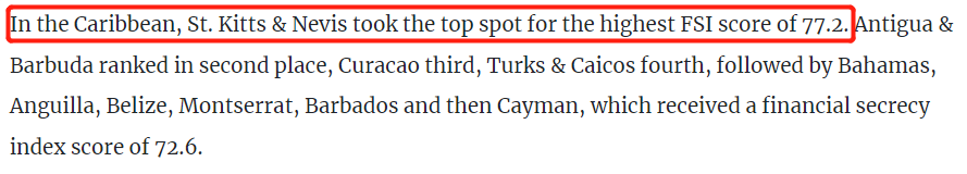 近期,圣基茨和尼維斯更是憑借77.2的最高FSI得分位居加勒比地區「金融保密指數」榜首!