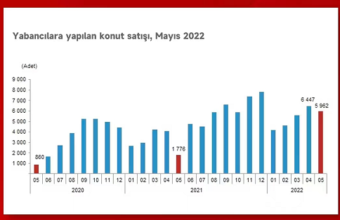 5月份對外銷售房屋比上年同期增長235.7%,達(dá)到5962套。5月份,外國人房屋銷售占房屋銷售總額的比例為4.9%。伊斯坦布爾以 2451 套房屋的銷售量位居外國人房屋銷售榜首。