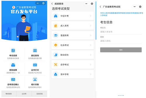 考生關注廣東省教育考試院官方微信(ID:gdsksy),底部選擇“小程序”欄,點擊進入“廣東省教育考試院”小程序,即可查詢考試成績。