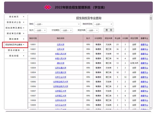 即日起,考生可在系統登錄頁面左邊的“招生院校及專業查詢”欄目查看今年全國聯招所有招生院校的招生信息??忌蛇x擇院校所在地、批次、計劃類別、招生科類,篩選相關院校的招生信息,快速、有針對性地了解到自己感興趣的院校的招生信息。