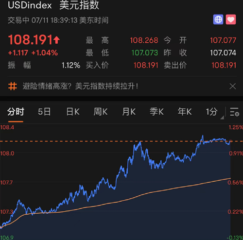 7月11日,美元指數飆升大漲1.2%,突破108,創2002年10月以來的最高水平。