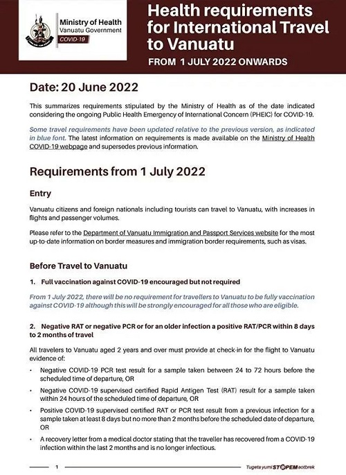 據當地媒體報道,瓦努阿圖已于7月1日重新開放邊界。國際游客可以通過空運和海運前往該國,游輪現在可以不受限制地進入瓦努阿圖水域。瓦努阿圖鼓勵但不再強制要求訪客完全接種疫苗,訪客抵達后若無新冠癥狀,則無需隔離及核酸檢測。