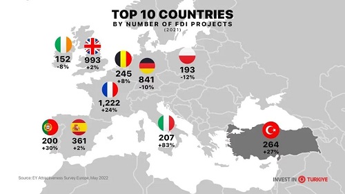根據安永歐洲吸引力調查 (EY Attractiveness Survey Europe) 數據,由于全球供應鏈的重構,2021年在土耳其的外國直接投資項目數量激增27%。
