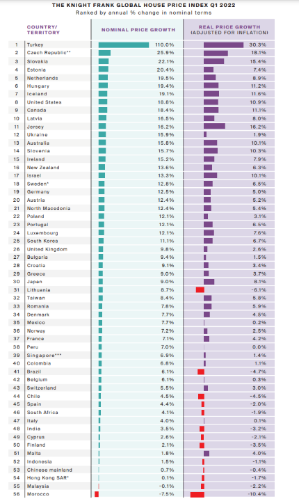 房地產咨詢公司萊坊(Knight Frank)日前發布了《2022年第一季度全球房價指數》(Global House Price Index Q1 2022),土耳其房價年增長幅度為110%,是所有國家中最高的。在納入研究的56個國家中,平均年價格漲幅為10.2%。