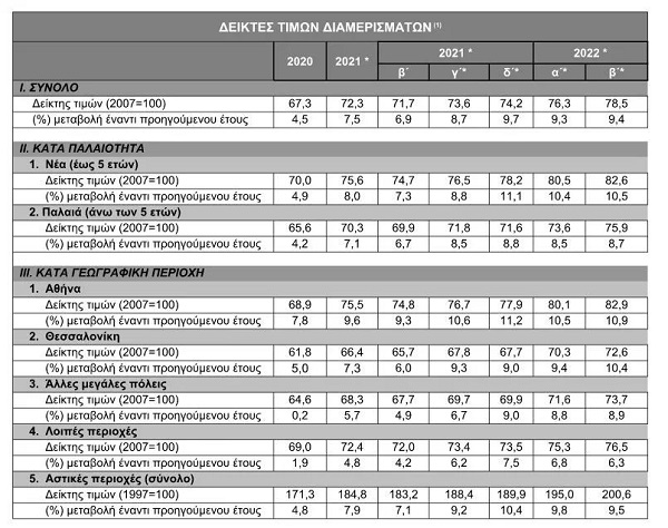 根據希臘銀行的數據,與2021年同期相比,2022年第二季度公寓價格平均上漲 9.4%。2022 年第一季度相應漲幅為 9.3%,而2021年全年公寓價格年均上漲7.5%。