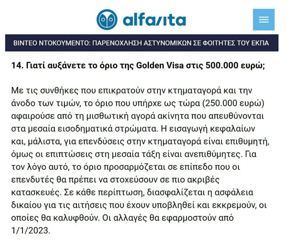希臘黃金簽證將由25萬歐元漲價至50萬歐元,就在9月16日,勞工和社會事務部發布了對政府新住房政策的問答,其中提及希臘黃金簽證的漲價日期為2023年1月1日。