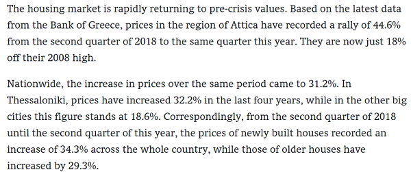阿提卡地區房價上升44.6%,塞薩洛尼基的房價上升32.2%,其他大城市房價上升18.6%;