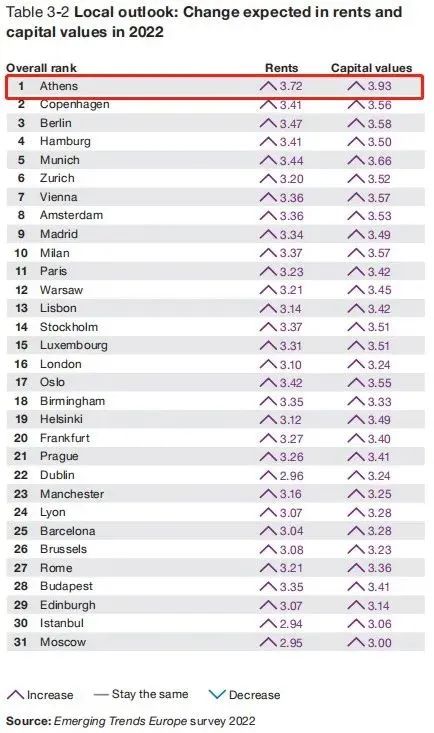 希臘雅典在2022年租金增長和房產升值預期方面取得最高分,從2021年的第九名升至第一名,位列31個參與統計的歐洲國家第一,排在其后的是哥本哈根、柏林、漢堡和慕尼黑。
