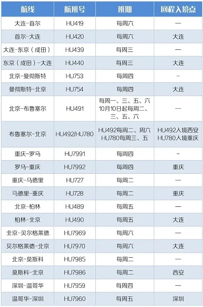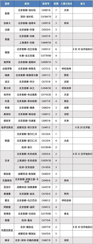 2022年9月1日-10月31日,中國國航國際航班計(jì)劃如下: