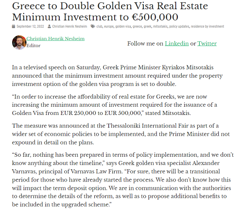 2022年以來,眾多投資移民項目紛紛調整投資額要求,希臘移民投資額從25萬歐元提高到50萬歐元引發了廣泛關注,雖然相關修改細則暫時沒有具體的解釋,但希臘政府正在進一步修改黃金簽證計劃的框架。