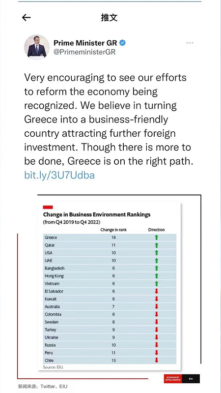總理米佐塔基斯推文:希臘經濟復蘇,營商環境改善,吸引外資成果顯著,排名升幅歐洲第一。